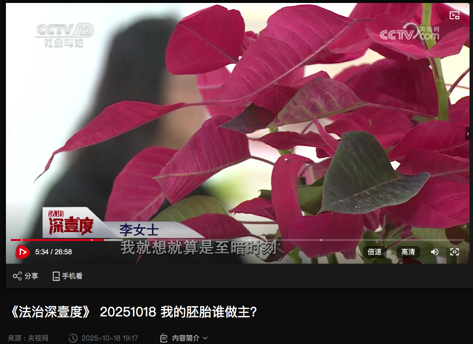 10月18日,央視社會與法頻道《法治深壹度》節(jié)目播發(fā)專題報道《我的胚胎誰做主?》,報道一起喪偶婦女輔助生殖權(quán)益案。據(jù)介紹,福建李女士在丈夫不幸去世后,希望利用夫妻二人在醫(yī)院冷凍保存的胚胎繼續(xù)實施移植手術(shù),但醫(yī)院鑒于醫(yī)學(xué)倫理問題拒絕了她的請求。隨后李女士將醫(yī)院起訴至法院,一審和二審均被駁回。直至2022年6月,福建省高級人民法院再審認(rèn)為,李女士要求醫(yī)院為其實施胚胎移植手術(shù)生育二胎有充分的法律依據(jù),并且還能在精神上撫慰雙方的老人,最終判決醫(yī)院繼續(xù)履行合同,為李女士實施胚胎移植手術(shù)。該報道采訪到李女士本人、醫(yī)院代理律師、法學(xué)專家及法官,全面回顧李女士個人遭遇、情感動機以及案件背后的法理爭議。