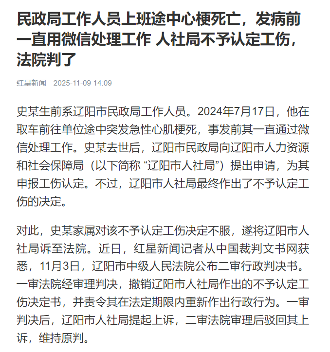 一審判決后,遼陽(yáng)市人社局提起上訴,請(qǐng)求撤銷該行政判決書。史某家屬則辯稱,同意一審判決理由,應(yīng)當(dāng)駁回上訴,維持原判。遼陽(yáng)市民政局陳述意見稱,同意給工傷認(rèn)定。2025年11月3日,遼陽(yáng)市中級(jí)人民法院作出二審判決,駁回遼陽(yáng)市人社局上訴,維持原判。