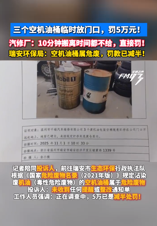 11月4日,據(jù)溫州市新聞傳媒中心《溫州晚間報道》欄目報道,溫州瑞安一汽修店負(fù)責(zé)人彭先生求助稱,近日因廠里地面做地坪漆,臨時將三個空機油桶挪到門口,11月1日瑞安市生態(tài)環(huán)保行政執(zhí)法隊到店檢查,當(dāng)場對此定性為“隨意擺放危險廢物”,直接通知要對該違法行為處罰5萬元,執(zhí)法人員稱“簽字認(rèn)罰5萬、不簽字則罰10萬”。彭先生認(rèn)為處罰過重,無法接受。