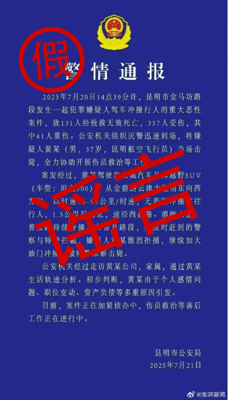 7月20日中午時分,多名網(wǎng)民發(fā)布視頻稱,云南省昆明市金馬碧雞坊附近發(fā)生一起交通肇事逃逸案件。7月21日上午,一份落款為“昆明市公安局”的“警情通報”在網(wǎng)絡(luò)流傳,稱“該重大惡性案件致131人死亡,337人受傷,公安機(jī)關(guān)已將嫌疑人黃某當(dāng)場擊斃。初步判斷,黃某由于個人感情問題、職位變動、資產(chǎn)負(fù)債等多重原因駕車撞人”。通報中傷亡人數(shù)巨大引發(fā)網(wǎng)民震驚和追問,但也有部分網(wǎng)民質(zhì)疑通報真實性,認(rèn)為該通報格式、內(nèi)容、邏輯等均有問題。7月21日中午,昆明市交管支隊發(fā)布警情通報稱,該事件系交通肇事逃逸,事故共造成2人死亡,9人受傷。肇事者李某某已被抓獲,已排除酒駕、毒駕嫌疑。7月23日,昆明市公安局五華分局通報稱,白某某、陳某某為博取關(guān)注、吸引眼球,傳播虛假“警情通報”,已被刑事拘留。8月1日,公安部網(wǎng)安局微信公眾號將此案作為“凈網(wǎng)——2025”專項行動的典型案例予以發(fā)布。
