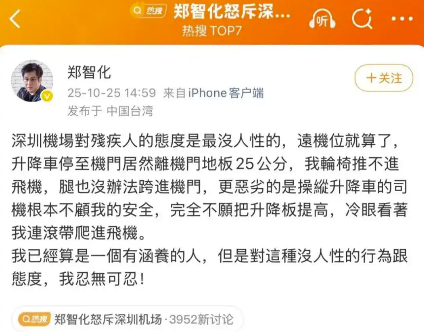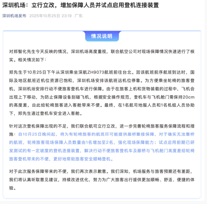 10月25日14時(shí)59分,中國(guó)臺(tái)灣歌手鄭智化通過(guò)微博賬號(hào)發(fā)文控訴其在深圳機(jī)場(chǎng)遭遇“不人性”對(duì)待:“操縱升降車的司機(jī)根本不顧我的安全,完全不愿把升降板提高,冷眼看著我連滾帶爬進(jìn)飛機(jī)?!?小時(shí)后,相關(guān)話題出現(xiàn)在微博熱搜榜上,引發(fā)網(wǎng)民一致聲討涉事機(jī)場(chǎng)。當(dāng)日18時(shí)許,深圳機(jī)場(chǎng)在該微博評(píng)論區(qū)留言致歉,表示已啟動(dòng)核查,將以此為契機(jī)優(yōu)化特殊旅客的服務(wù)保障細(xì)節(jié)。23時(shí)許,深圳機(jī)場(chǎng)通過(guò)微信公眾號(hào)再發(fā)情況說(shuō)明,稱將進(jìn)一步完善廊橋靠接保障、人員增配等多項(xiàng)整改措施,更好幫助旅客安全順暢登機(jī)。