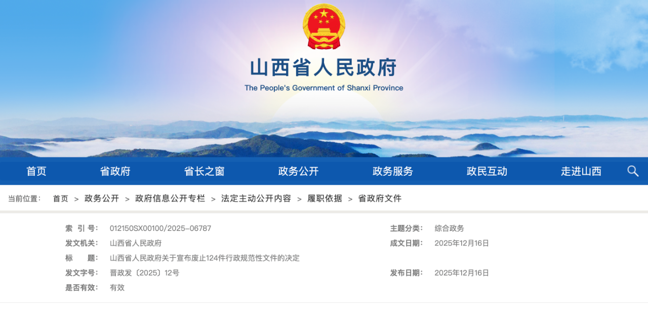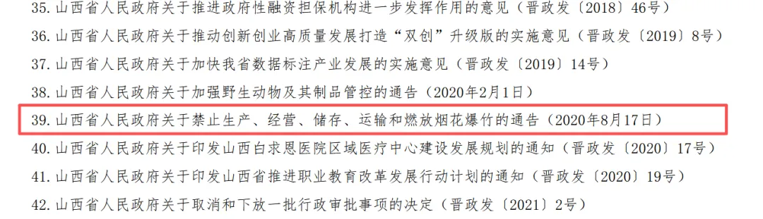12月16日,《山西省人民政府關于宣布廢止124件行政規(guī)范性文件的決定》公布,其中,2020年8月17日發(fā)布、同年10月1日起正式實施的《山西省人民政府關于禁止生產(chǎn)、經(jīng)營、儲存、運輸和燃放煙花爆竹的通告》被納入廢止目錄,該通告自12月16日起停止執(zhí)行,不再作為行政管理依據(jù)。