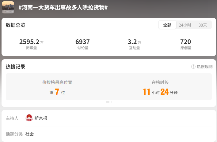 截至12月29日14時,全網(wǎng)相關(guān)信息1.2萬余條,“#河南一大貨車出事故多人哄搶貨物#”“#警方介入貨車出事故貨物遭哄搶#”“#貨車事故貨物被哄搶司機(jī)嘶吼別搶了#” 等相關(guān)微博話題閱讀量累計(jì)超3500萬。