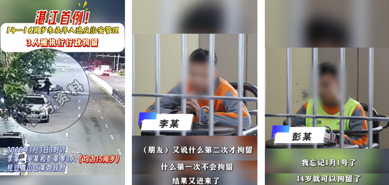 1月8日,《湛江晚報(bào)》報(bào)道稱,1月3日,廣東湛江3名15歲少年因持械追打他人涉嫌尋釁滋事,被依法行政拘留13天。這是2026年1月1日新修訂的《中華人民共和國(guó)治安管理處罰法》施行以來,該市首例對(duì)14至16周歲未成年人執(zhí)行行政拘留的案件。