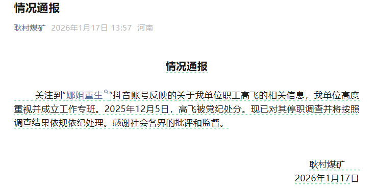 1月17日,男方單位通過“耿村煤礦”微信公眾號發(fā)布情況通報(bào)稱,關(guān)注到相關(guān)信息,單位高度重視并成立工作專班。2025年12月5日,高某被黨紀(jì)處分?,F(xiàn)已對其停職調(diào)查并將按照調(diào)查結(jié)果依規(guī)依紀(jì)處理。另據(jù)“@二三里資訊”報(bào)道,高某被停工,韓某已從原部門調(diào)至洗煤廠工作。