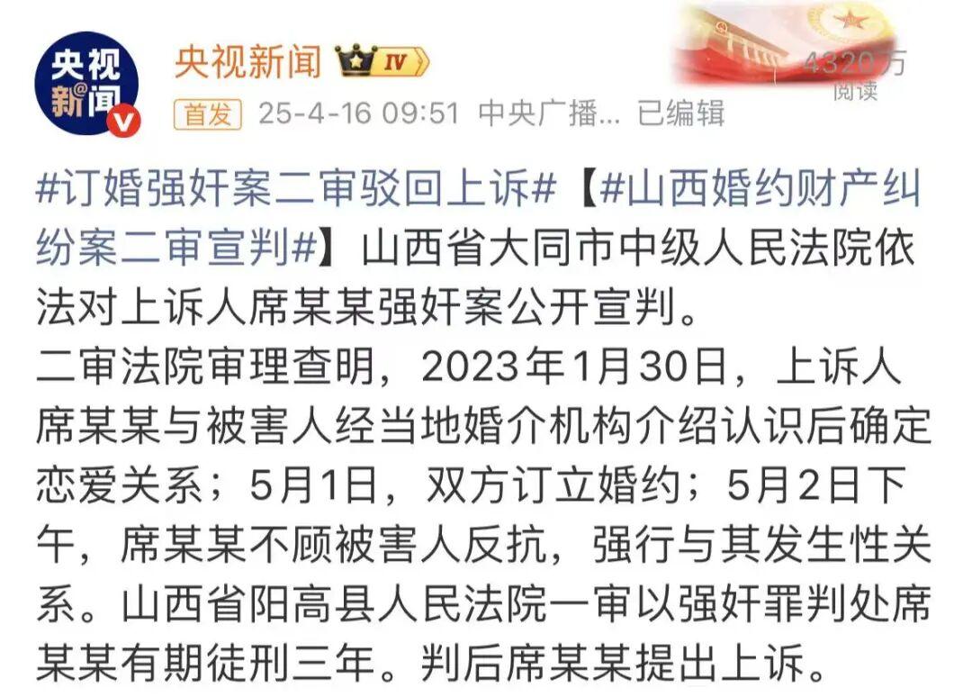 據(jù)澎湃新聞等媒體報(bào)道,2025年3月25日,山西大同“訂婚強(qiáng)奸案”當(dāng)事人席某某強(qiáng)奸上訴案及涉婚約財(cái)產(chǎn)糾紛上訴案,在大同市中院不公開審理。庭審過程中,受害人和被告人雙方重點(diǎn)圍繞是否實(shí)質(zhì)性發(fā)生關(guān)系、案件新證據(jù)證明力等問題展開辯論。4月2日,被告人席某某母親鄭某某前往大同市檢察院提交控訴材料,請(qǐng)求對(duì)陽高縣公安局和縣檢察院涉及本案的12名辦案人員以涉嫌程序違法、玩忽職守追究責(zé)任。4月16日,大同市中院二審公開宣判,裁定駁回上訴,維持原判,席某某因強(qiáng)奸罪被判處有期徒刑三年。同日,對(duì)于該案所涉的婚約財(cái)產(chǎn)糾紛案,二審法院駁回上訴、維持原判。法院宣判后,辦案法官通過“@人民日?qǐng)?bào)”“@央視新聞”進(jìn)行釋法解讀,圍繞席某某強(qiáng)奸罪名為何成立、認(rèn)定強(qiáng)奸事實(shí)的主要證據(jù)、女方是否騙婚、為何沒有判處席某某緩刑、審判是否受到輿論影響等方面作出回應(yīng)。5月14日,媒體報(bào)道稱,山西大同“訂婚強(qiáng)奸案”被列入人民法院案例庫,意味著該案例對(duì)類案審判具有示范價(jià)值,再次引發(fā)輿論熱議。