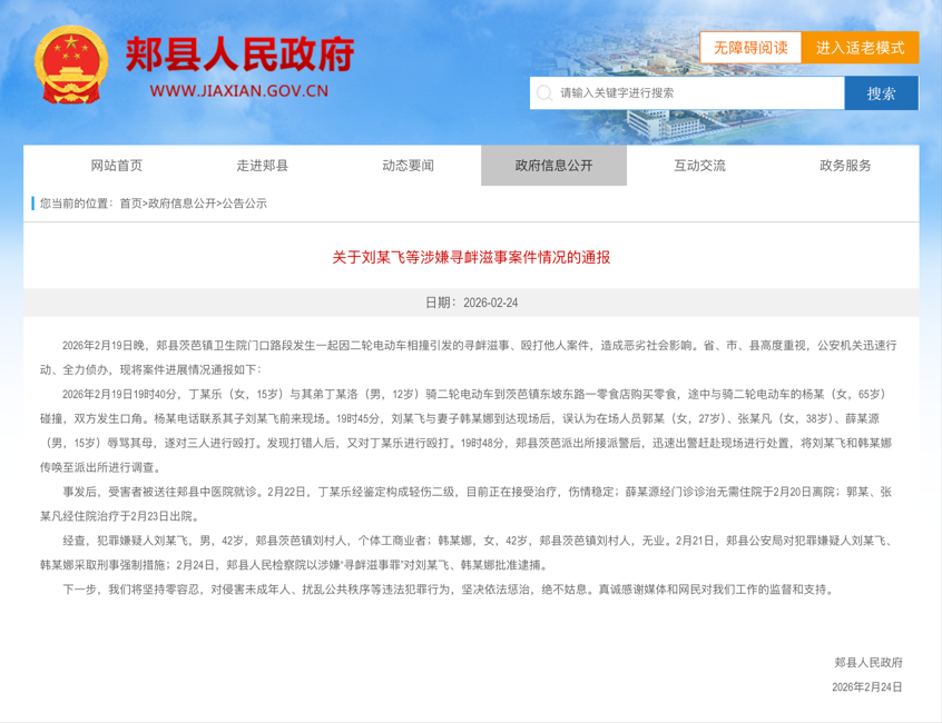 2月24日,平頂山市郟縣人民政府跟進發(fā)布詳細通報,稱劉某飛與妻子韓某娜到達現(xiàn)場后,誤認為在場人員郭某、張某凡、薛某源辱罵其母,遂對三人進行毆打。發(fā)現(xiàn)打錯人后,又對丁某樂進行毆打。通報確認被打女孩丁某樂傷情鑒定為輕傷二級,目前正在接受治療,三名勸架路人經(jīng)診治均已離院。經(jīng)查,犯罪嫌疑人劉某飛,男,42歲,郟縣茨芭鎮(zhèn)劉村人,個體工商業(yè)者;韓某娜,女,42歲,郟縣茨芭鎮(zhèn)劉村人,無業(yè)。24日,郟縣人民檢察院以涉嫌尋釁滋事罪對劉某飛、韓某娜批準逮捕。