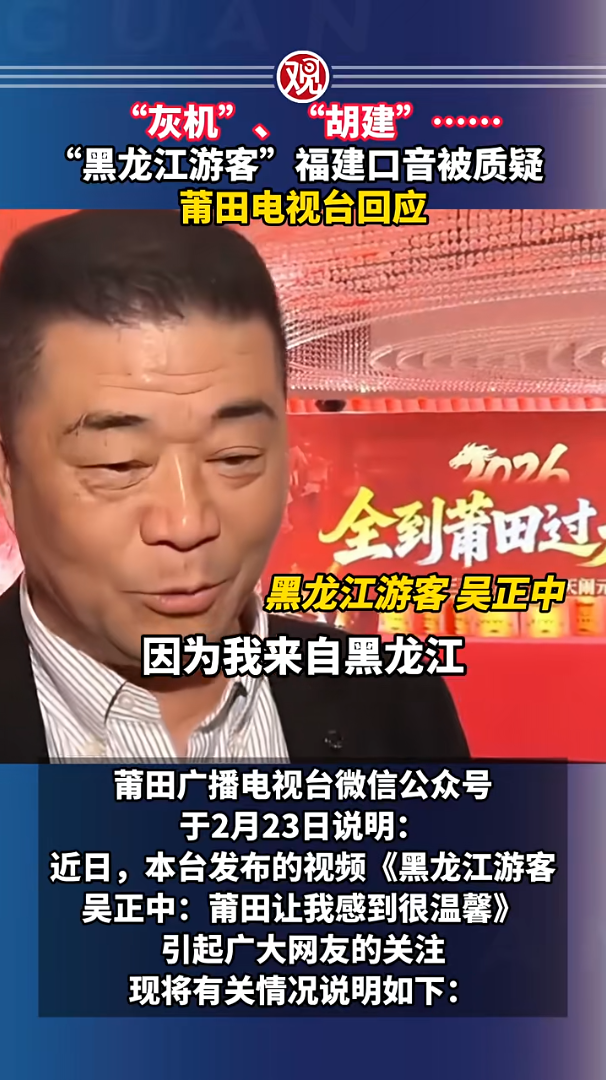 2月21日,福建莆田廣播電視臺(tái)為宣傳當(dāng)?shù)亍叭狡翁镞^大年”新春文旅活動(dòng),發(fā)布了一則視頻《黑龍江游客吳正中:莆田讓我感到很溫馨》。視頻中吳正中自稱黑龍江游客,稱“專程坐飛機(jī)11小時(shí)來(lái)莆田過年”,并盛贊當(dāng)?shù)睾ur和民俗。然而細(xì)心的網(wǎng)民發(fā)現(xiàn)其口音帶有典型的福建方言特征,如將“飛機(jī)”讀作“灰機(jī)”、“福建”讀作“胡建”,對(duì)其“東北人”的身份表示懷疑。