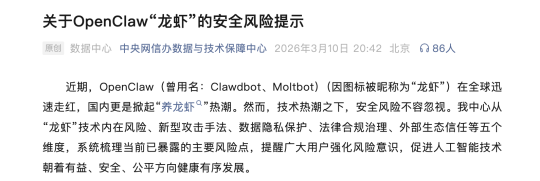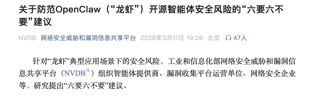3月10日和11日,中央網(wǎng)信辦、工業(yè)和信息化部先后發(fā)布關(guān)于OpenClaw“龍蝦”的安全風(fēng)險(xiǎn)提示,從“龍蝦”技術(shù)內(nèi)在風(fēng)險(xiǎn)、新型攻擊手法、數(shù)據(jù)隱私保護(hù)、法律合規(guī)治理、外部生態(tài)信任等維度,系統(tǒng)梳理當(dāng)前已暴露的主要風(fēng)險(xiǎn)點(diǎn),并提出“六要六不要”的規(guī)范指引,提醒用戶強(qiáng)化風(fēng)險(xiǎn)意識,引導(dǎo)人工智能技術(shù)安全、有序、健康發(fā)展。