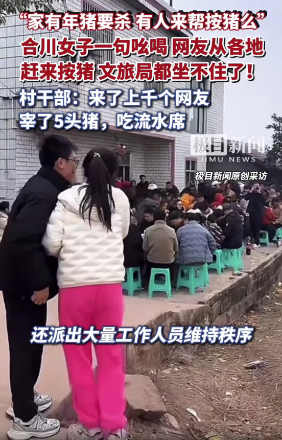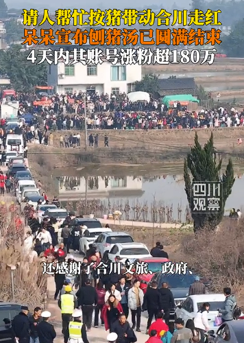 1月9日凌晨,來自重慶合川的抖音博主“呆呆”發(fā)視頻稱,1月11日家中要?dú)深^豬,因?yàn)楦改改挲g大了按不住,希望有人幫忙按豬,將請吃刨豬湯答謝,“呆呆”還開玩笑稱“就想家門口停滿車,在村里揚(yáng)眉吐氣一回”。短短兩日,視頻點(diǎn)贊量突破18萬,轉(zhuǎn)發(fā)量超14萬,“呆呆”建立的6個(gè)500人的“刨豬湯”群很快滿員。盡管“呆呆”連夜采購食材并報(bào)備派出所,但已無法阻止網(wǎng)民熱情。1月10日凌晨,合川文旅緊急抽調(diào)工作人員趕赴現(xiàn)場,協(xié)助保障活動(dòng)順利進(jìn)行。1月11日,來自全國各地超4000名網(wǎng)民匯聚“呆呆”家鄉(xiāng),其中不乏“鹵鵝哥”等知名網(wǎng)紅。1月11日至12日,“呆呆”連開多場直播,邀請網(wǎng)民參加家鄉(xiāng)大聯(lián)歡,直播間觀看和點(diǎn)贊人數(shù)均超3000萬人次。在合川文旅、愛心企業(yè)、網(wǎng)民等多方贊助下,原計(jì)劃的兩頭豬增至五頭,現(xiàn)場設(shè)五個(gè)分會場分散人流,公安部門疏導(dǎo)交通。合川文旅部門帶著本地特產(chǎn)、景區(qū)門票到現(xiàn)場,講解“刨豬宴”和合川歷史文化,還設(shè)置篝火、煙花、舞龍等環(huán)節(jié)。據(jù)現(xiàn)場網(wǎng)民透露,當(dāng)?shù)匾还矓[了300桌宴席,最多時(shí)同時(shí)有超3000人。該事件引發(fā)熱烈討論,“殺豬女孩呆呆一天漲粉150萬”“呆呆殺豬宴一天蒸1000多斤大米”等多個(gè)話題沖上社交平臺熱搜。