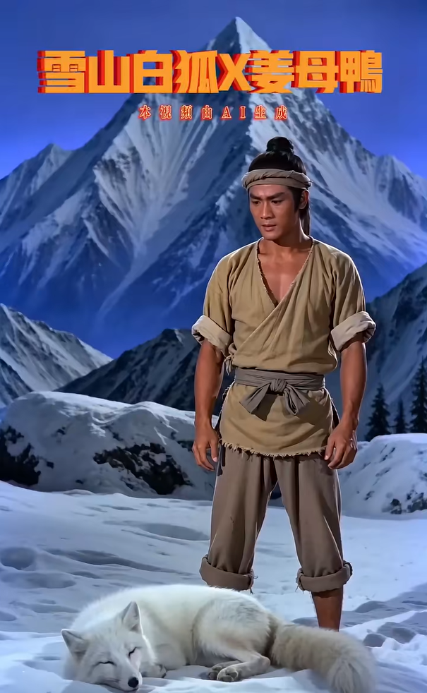 2月27日,抖音用戶“川娃醬板鴨”發(fā)布一則AI短片《雪山救狐》,視頻將“狐貍報(bào)恩”的片段改編成救狐貍時(shí)送上一只“醬板鴨”,隨后“醬板鴨”轉(zhuǎn)世成人上門復(fù)仇的故事。其中,“你可曾在雪山救過(guò)一只狐貍”“我不是狐貍,我是那只醬板鴨”等魔性臺(tái)詞與邵氏武俠風(fēng)搭配,立刻吸引網(wǎng)民關(guān)注。隨后,網(wǎng)民通過(guò)AI技術(shù),將“醬板鴨”替換為北京烤鴨、豆汁、胡辣湯等各種元素,接力改編幽默劇情,宣傳各地多樣文化。