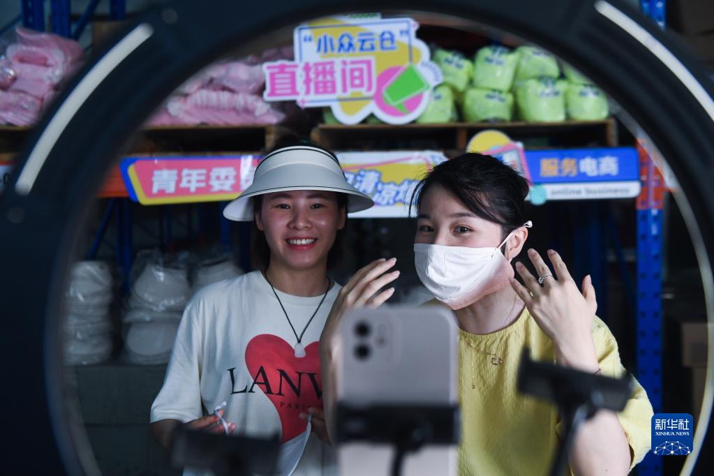 6月27日,在義烏市蘇溪鎮(zhèn)愛德瑪電商園的“小眾云倉”站點內,工作人員在進行夏季防曬用品直播銷售。