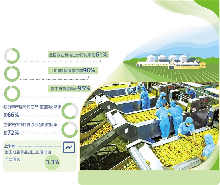 “農業(yè)不加工,到頭一場空”。過去,受制于加工技術,農產品加工普遍同質化,精深加工不足,加工轉化率低。中國農科院農產品加工研究所所長王鳳忠說,針對加工的科技短板,全國300多家龍頭企業(yè)和科研機構成立了國家農產品加工產業(yè)科技創(chuàng)新聯(lián)盟。數(shù)據(jù)顯示,截至目前,我國已經建立農產品綠色加工技術體系,開發(fā)形成了4大類、22個中類、57個小類共計數(shù)萬種食品。加工技術在全程冷鏈、精深加工、營養(yǎng)健康等領域快速發(fā)展,推動了農產品加工業(yè)質量提升。上半年,全國農副食品加工業(yè)增加值同比增長3.3%。