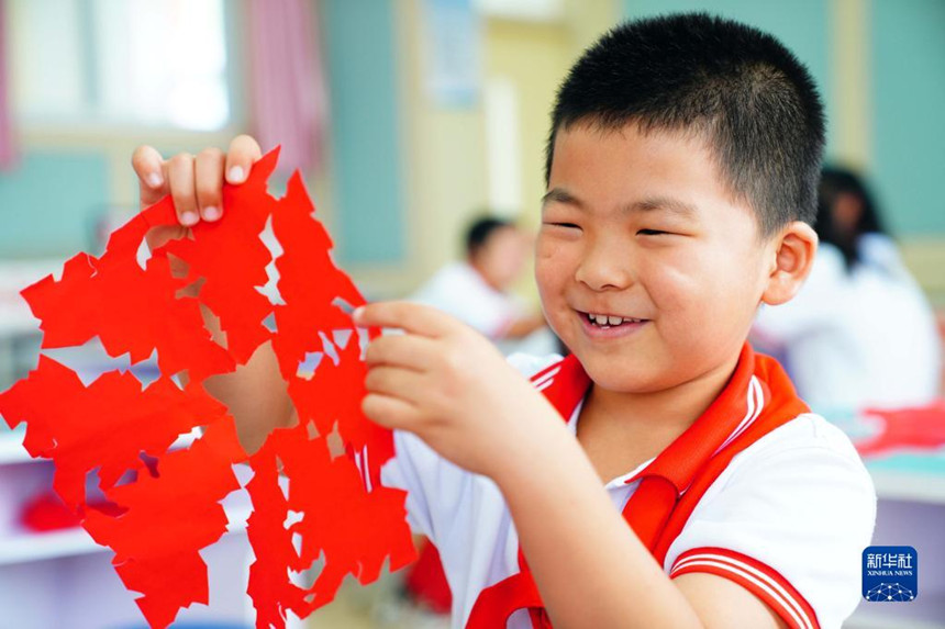 7月28日,在山東省齊河縣祝阿鎮(zhèn)馬坊社區(qū)鄉(xiāng)村“復(fù)興少年宮”,一名小朋友展示自己的剪紙。
