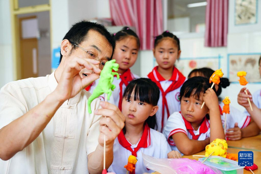 7月28日,在山東省齊河縣祝阿鎮(zhèn)馬坊社區(qū)鄉(xiāng)村“復(fù)興少年宮”,王向東在教小朋友捏面塑。