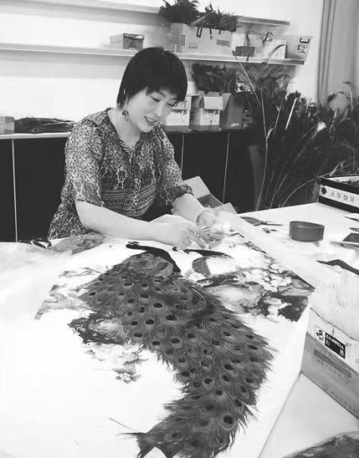 安徽省阜陽(yáng)市“巾幗新農(nóng)人”、安徽藍(lán)翎生態(tài)農(nóng)業(yè)科技有限公司董事長(zhǎng)關(guān)麗在制作孔雀羽毛壁畫。