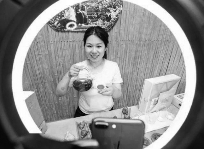 安徽省黃山市“巾幗新農(nóng)人”、祁門縣際源春茶業(yè)有限公司總經(jīng)理江雪霞在直播銷售粽茶。 陳晨/攝