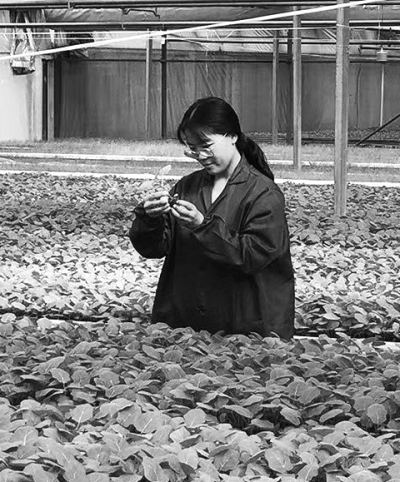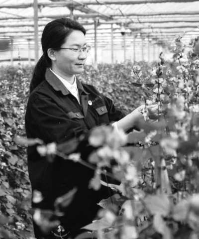 河北省滄州市“巾幗新農(nóng)人”、肅寧縣綠苑蔬菜專業(yè)合作社經(jīng)理張莎莎查看蔬菜秧苗生長(zhǎng)情況。