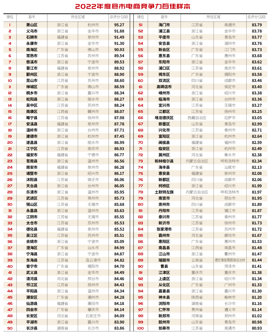 作為數(shù)字經(jīng)濟的一種形態(tài),縣域電商不僅是人們增收致富的重要渠道,也是驅動地方產(chǎn)業(yè)發(fā)展,甚至盤活整個縣域經(jīng)濟的一把利器。2022年5月,“2022年度縣市電商競爭力百佳樣本”榜單重磅發(fā)布,浙江省杭州市蕭山區(qū)、浙江省金華市義烏市、福建省泉州市石獅市、浙江省金華市永康市、廣東省佛山市南海區(qū)、江蘇省蘇州市常熟市、浙江省寧波市慈溪市、福建省泉州市晉江市、浙江省寧波市鄞州區(qū)、江蘇省蘇州市昆山市位列前十。