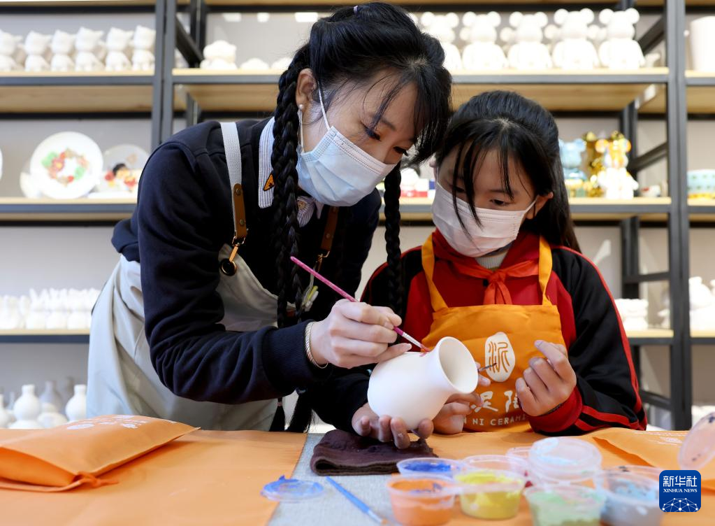 11月11日,江蘇省徐州市漢王鎮(zhèn)紫山村春泥陶藝的老師(左)在陶藝教室向?qū)W生講解彩陶繪陶的有關(guān)知識(shí)。