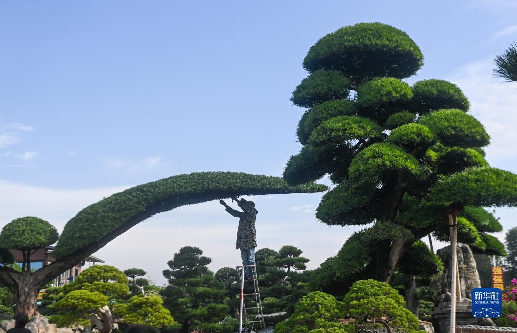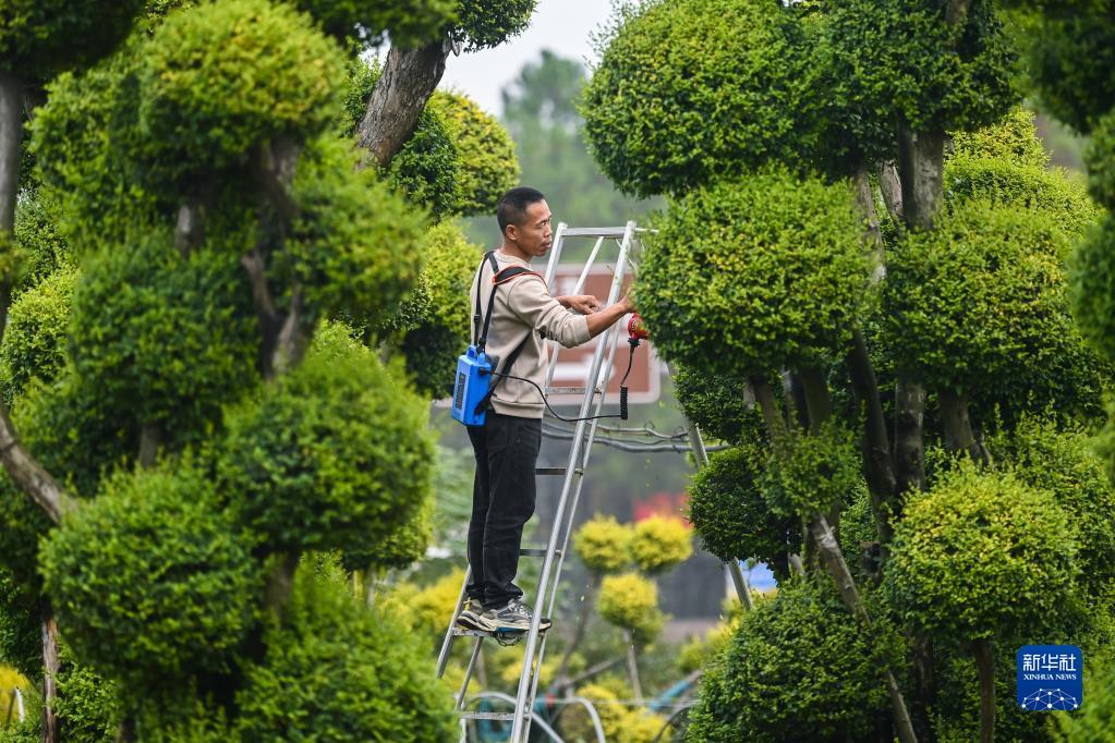 11月28日,在金華市金東區(qū)澧浦花木城的天越園藝苗圃內(nèi),種植戶在修剪樹木。