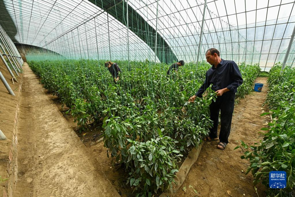 農(nóng)民在現(xiàn)代設(shè)施農(nóng)業(yè)示范基地物聯(lián)網(wǎng)日光溫室大棚為種植的辣椒整枝。記者 丁磊 攝