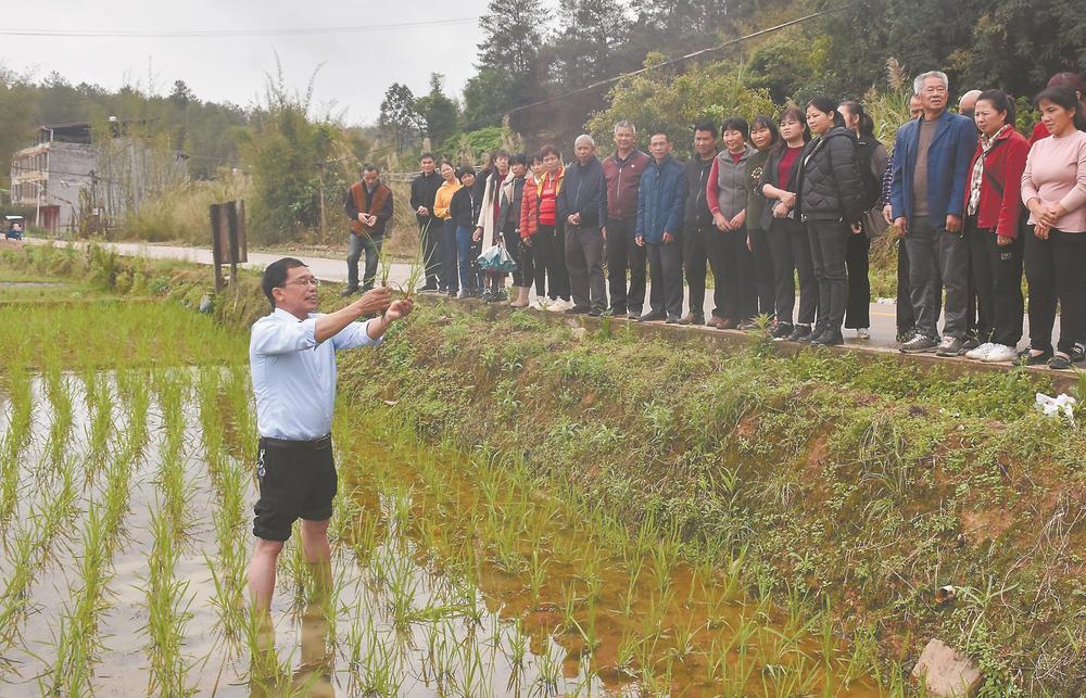 永定區(qū)2023年第七期高素質(zhì)農(nóng)民培訓(xùn)班上,專家在田里講授早稻病蟲害防治知識(shí)。