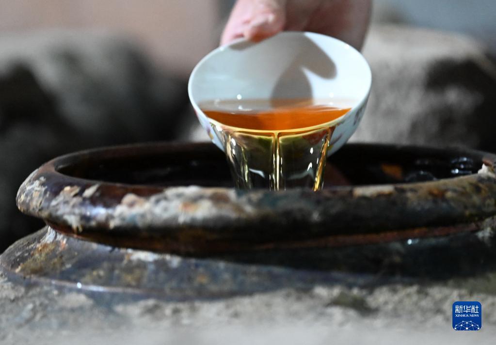 4月20日,村民吳善弟在北墘村的黃酒技藝體驗(yàn)館里展示釀酒過程。記者 林善傳 攝