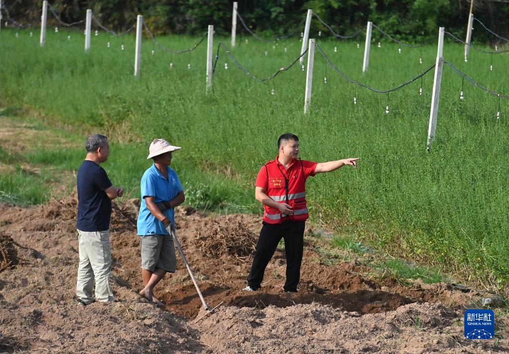 6月14日,窯上村駐村第一書(shū)記榮雙全(右一)在蔬菜基地查看發(fā)展情況。記者 黃孝邦 攝