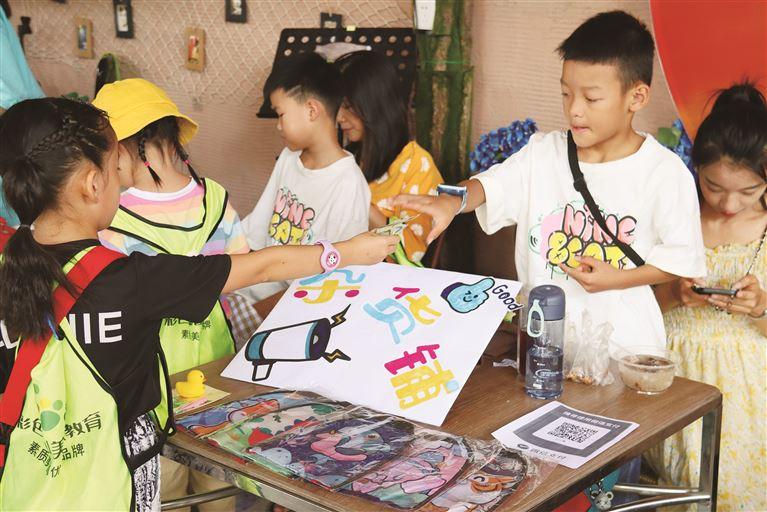活動(dòng)現(xiàn)場(chǎng),30多名“小賣手”吆喝著售賣漫畫(huà)作品、涼粉、米蟲(chóng)、涼粽、南瓜花、西紅柿、豆腐釀等,忙得不亦樂(lè)乎。