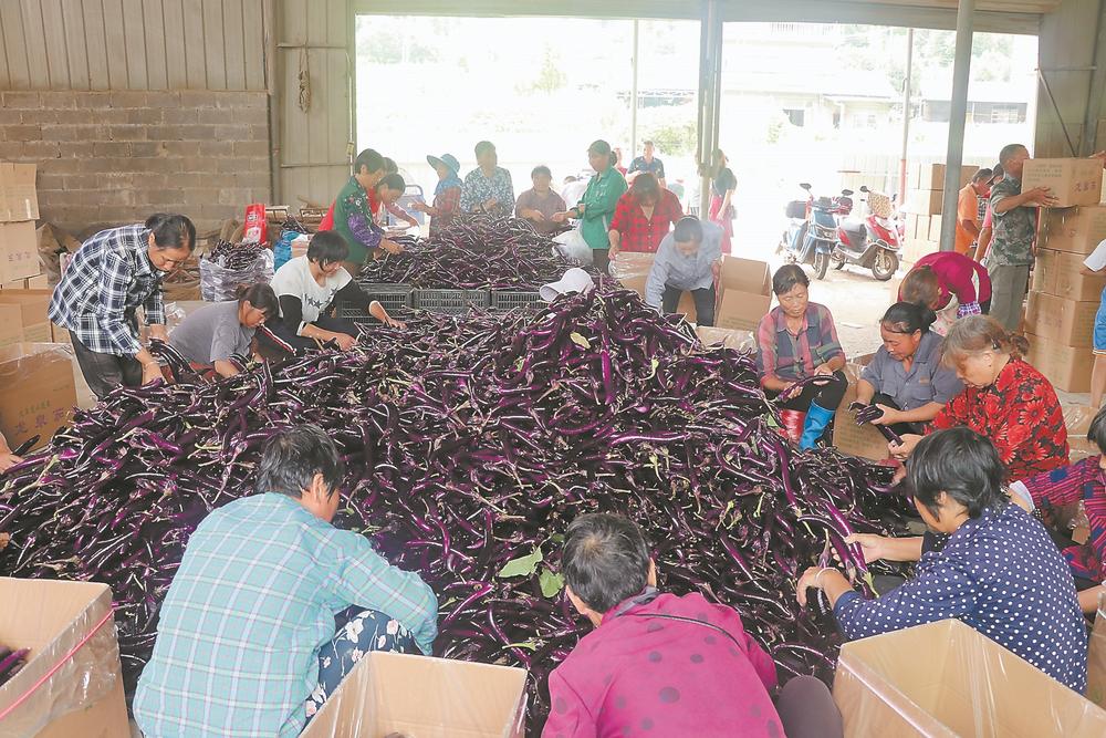 在高門村蔬菜種植基地,工人將茄子、絲瓜等新鮮蔬菜分裝打包 黃娜 攝