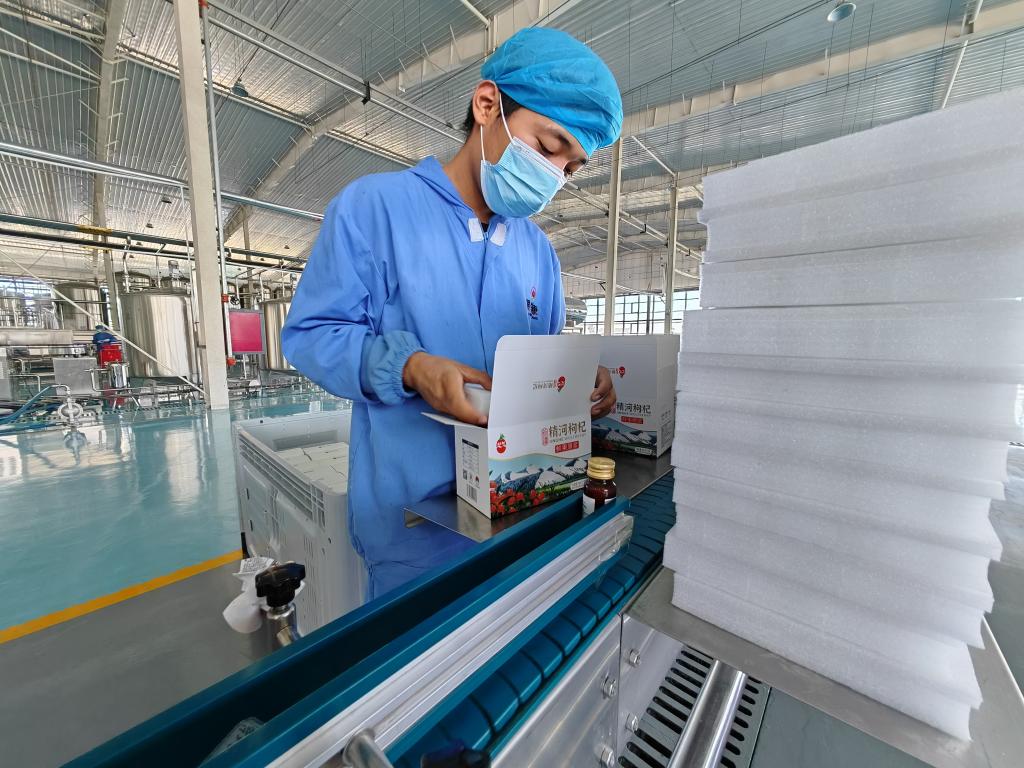9月21日,工人們在精河縣杞瑞生物科技有限責任公司生產(chǎn)車間包裝產(chǎn)品。新華社記者 茍立鋒 攝