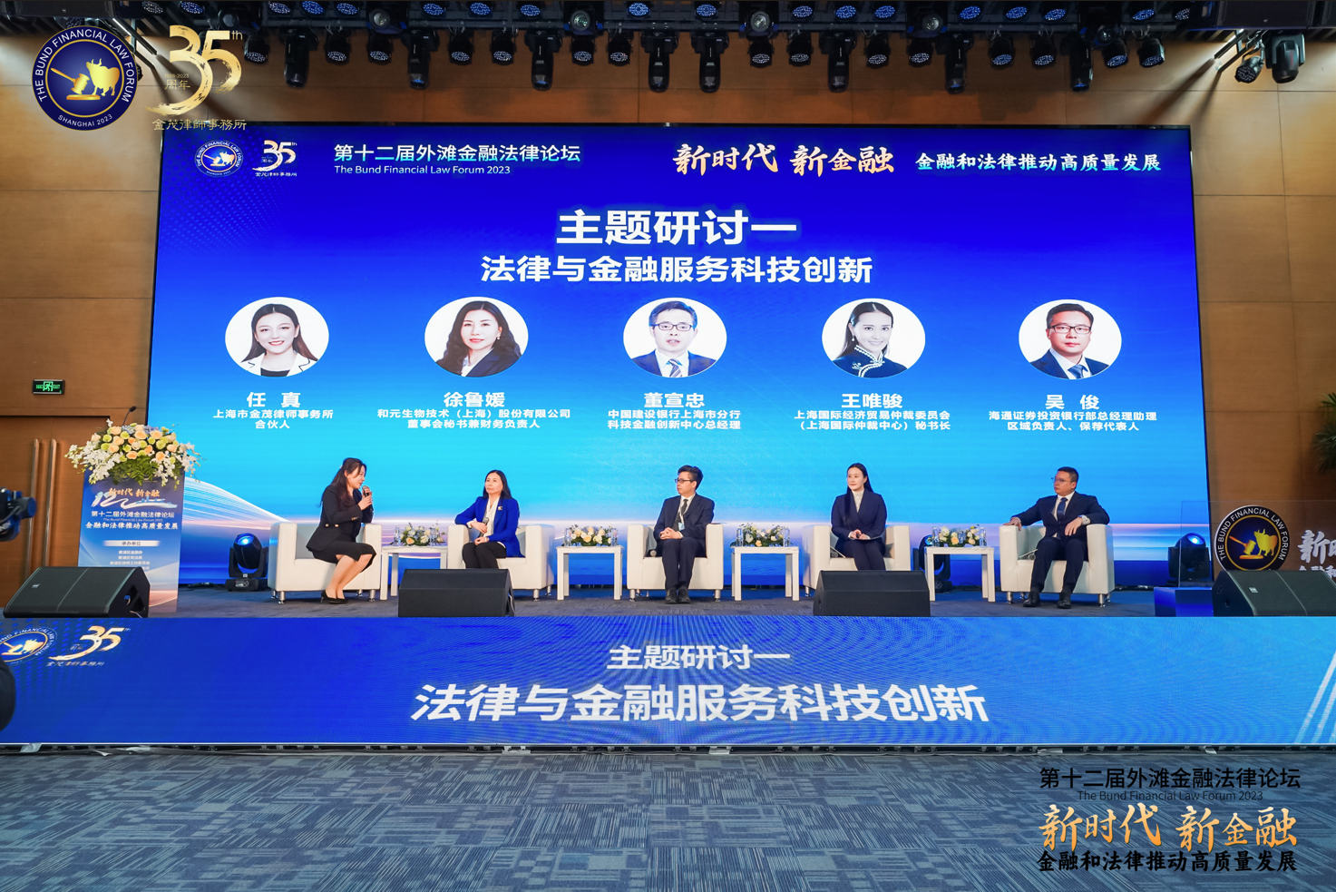 “法律與金融服務(wù)科技創(chuàng)新”主題研討環(huán)節(jié),由上海市金茂律師事務(wù)所合伙人任真律師主持,來自海通證券股份有限公司上海投資銀行部總經(jīng)理助理吳俊先生、上海國際經(jīng)濟貿(mào)易仲裁委員會(上海國際仲裁中心)秘書長王唯駿女士、中國建設(shè)銀行上海市分行科技金融創(chuàng)新中心總經(jīng)理董宣忠先生、和元生物技術(shù)(上海)股份有限公司董事會秘書兼財務(wù)負責(zé)人徐魯媛女士共同參與研討。