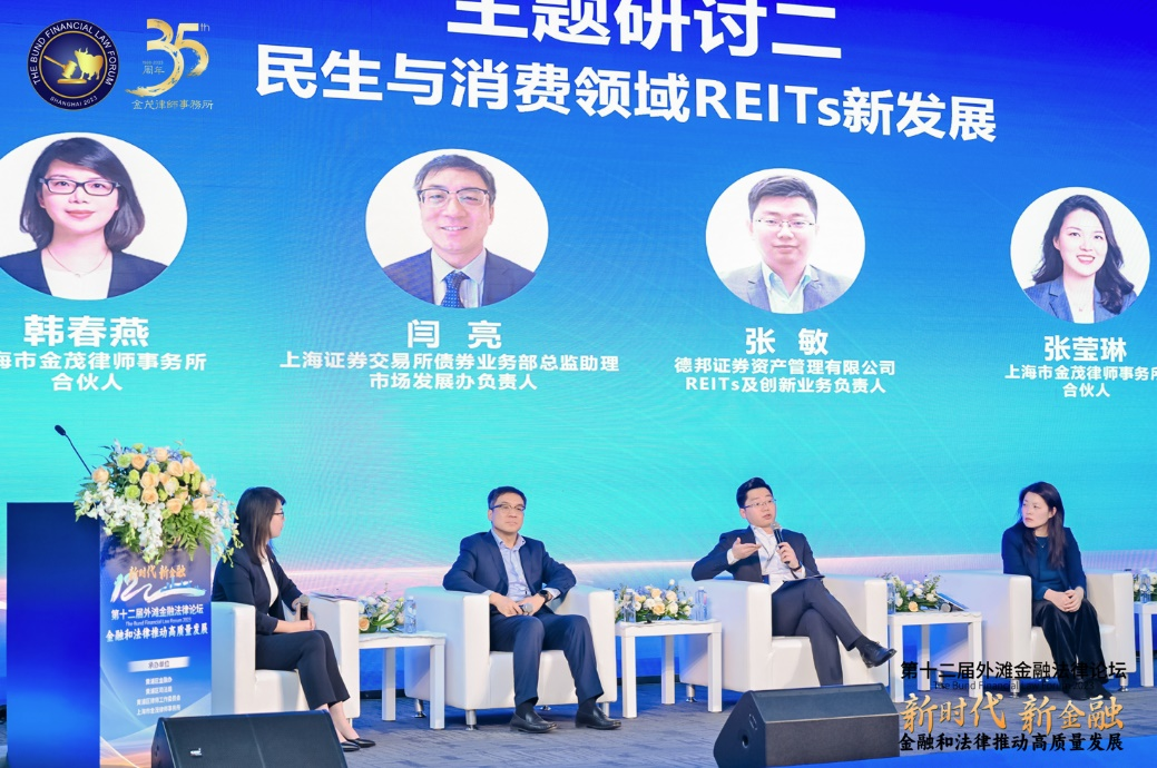 “民生與消費領(lǐng)域REITs新發(fā)展”主題研討環(huán)節(jié),由上海市金茂律師事務(wù)所合伙人韓春燕律師主持,來自上海證券交易所債券業(yè)務(wù)部總監(jiān)助理、市場發(fā)展辦負責(zé)人閆亮先生、德邦證券資產(chǎn)管理有限公司REITs及創(chuàng)新業(yè)務(wù)負責(zé)人先生、上海市金茂律師事務(wù)所合伙人張瑩琳律師共同參與研討。