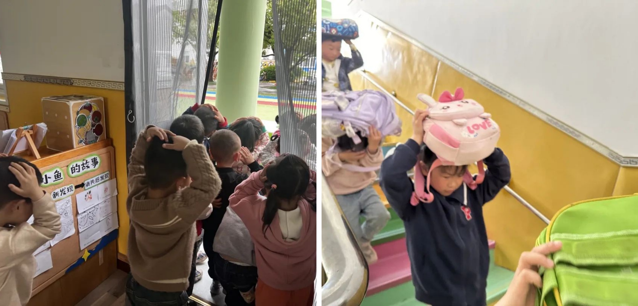 地震間隙,“警報(bào)解除”鈴聲響起,各班幼兒在老師的帶領(lǐng)下,按照指定逃生路線有序撤離至操場。孩子們聽從老師指揮,用手護(hù)住頭部,弓著腰,緊急有序地迅速撤離危險(xiǎn)地帶。孩子們撤離時不推拉、不沖撞、不擁擠。
