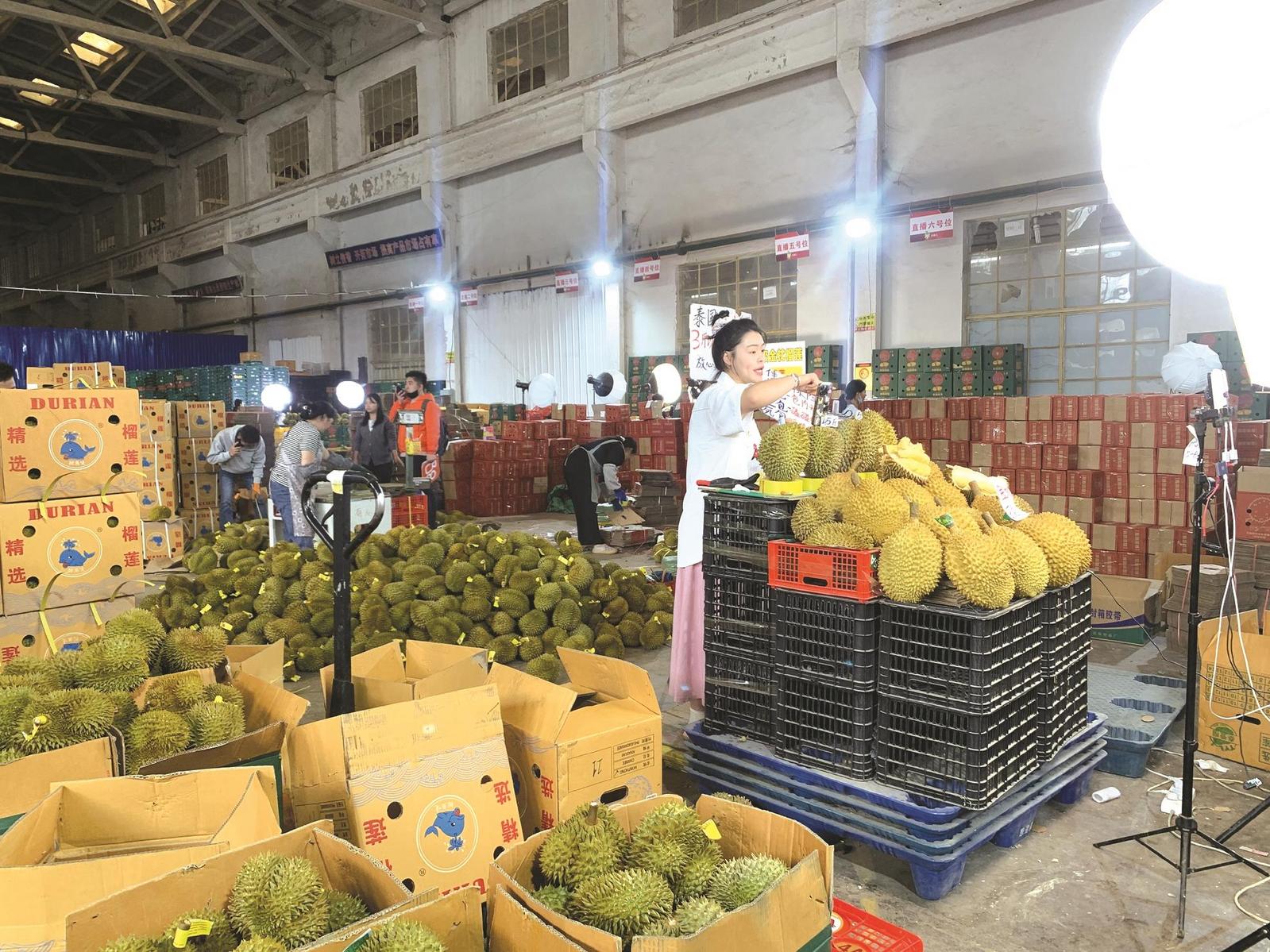 5月初的一個(gè)上午,記者在云南思珺兒生鮮供應(yīng)鏈基地看到,一筐筐沃柑、藍(lán)莓、人參果,以及從泰國運(yùn)來的榴蓮、山竹堆滿了倉庫,散發(fā)出濃濃果香。而在卸貨區(qū)的另一側(cè),分出了眾多直播區(qū),在兩盞燈、幾部手機(jī)前,一位主播正情緒飽滿地向屏幕前的粉絲介紹果品、釋疑解惑,一個(gè)個(gè)直播的小天地外,選果、打包更是一派繁忙景象。
