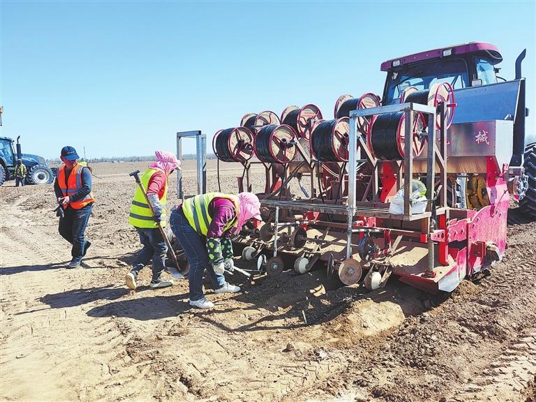 黃羊河農(nóng)場(chǎng)職工在調(diào)試滴灌農(nóng)機(jī)設(shè)備 記者 王朝霞