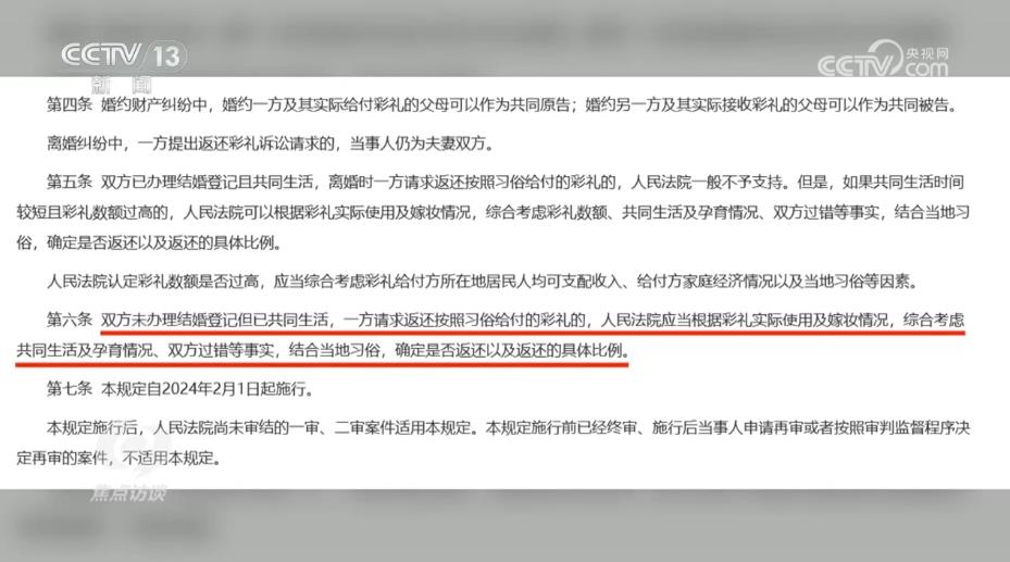 陜西省韓城市人民法院芝陽人民法庭庭長王春妮:“我們跟原告充分釋法明理,讓他知道咱們國家有新的規(guī)定,對他經(jīng)過反復(fù)做工作,他也降低了自己的心理預(yù)期。被告這邊認(rèn)為我跟你在一起共同生活了,我也是實(shí)心想跟你過日子,但是因?yàn)闆]有領(lǐng)證,而且我還跟你共同生育了一個孩子,你現(xiàn)在要求我給你返還彩禮,我就不愿意返還,心里有抵抗情緒?!?br/>