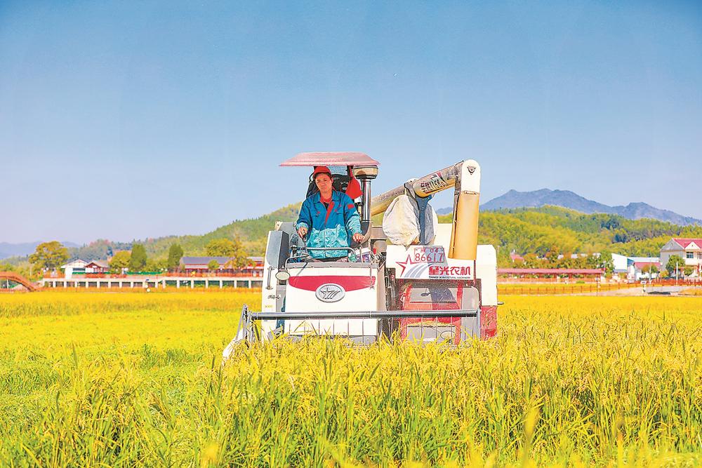 在三明一處稻田里,現(xiàn)代化的收割機(jī)正在作業(yè)(資料圖片)