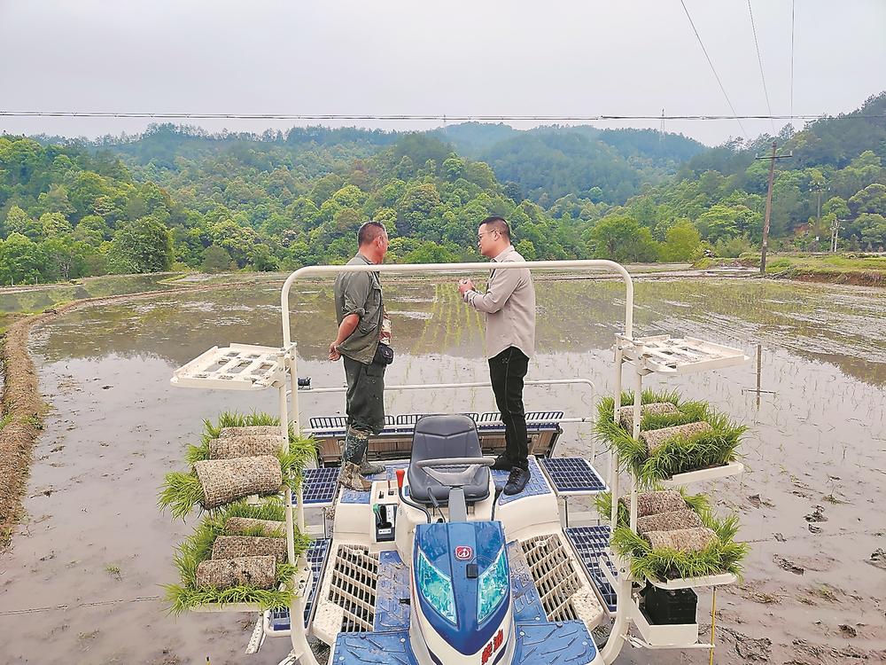 三明市清流縣的農(nóng)戶在新型插秧機(jī)上交流插秧事宜(資料圖片)