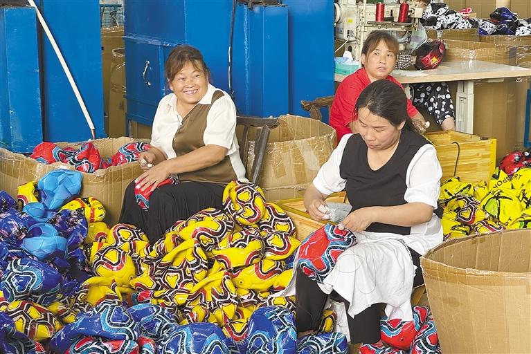 7月4日,在陜西省安康市漢陰縣平梁鎮(zhèn)興隆佳苑社區(qū)工廠,50多名女工緊張忙碌著。經(jīng)過裁剪、縫制、檢測等一道道工序,5000個足球下線,從大山深處走向市場。
