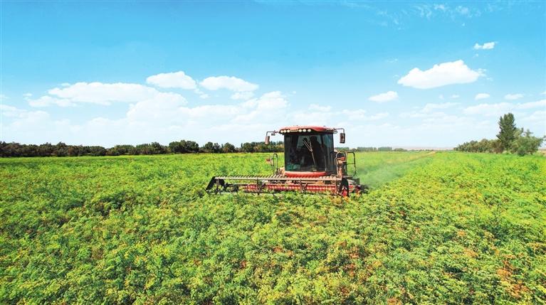 但見地里的苜蓿有高有低、呈波浪狀?!澳闱疲覀冝r(nóng)場進(jìn)行植株高低搭配,將個(gè)頭較高的WJ363HK苜蓿與個(gè)頭低的阿蒂娜間作套種,當(dāng)苜蓿大面積開花時(shí),能充分享受陽光,提高苜蓿牧草的粗蛋白含量?!壁w富強(qiáng)說著算了一筆賬:今年6月10日到20日,頭茬苜蓿成熟,19臺(tái)大型機(jī)械搶趕時(shí)間,一個(gè)多星期就收割結(jié)束,保障了粗蛋白含量高達(dá)20%以上;目前第二茬苜蓿只有40厘米高,長到7月下旬80厘米左右即可收割;第三茬苜蓿到9月中下旬時(shí)收割。1畝苜蓿收割3茬、可產(chǎn)900公斤至1噸干草,按照目前市場價(jià)1噸干草1600至1800元計(jì)算,收益可觀。