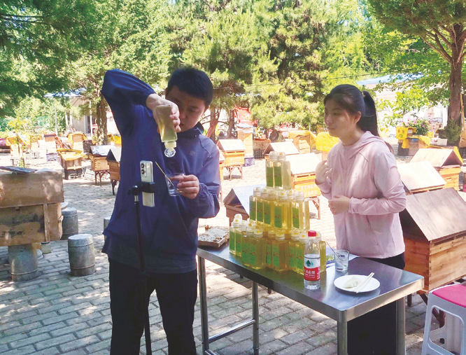 普社村第一場直播開始時,大山深處的大片洋槐花已開到了尾聲。景嘉麗和“90后”鎮(zhèn)紀(jì)檢干部劉勇一起站在鏡頭前,小蜜蜂在旁邊“嗡嗡嗡”地飛來飛去,鎮(zhèn)上干部圍站在鏡頭背后,很多村民也趕來看熱鬧。隨著直播間涌進(jìn)來的網(wǎng)友越來越多,提問也越來越多,兩人逐漸放松:“家人們,我們背后的山上全是洋槐樹,這里沒有污染,洋槐花蜜的品質(zhì)特別好?!笔讏鲋辈?,兩個小時賣出了300余單蜂蜜,價值2萬多元。對于一個地處大山深處的小鄉(xiāng)村而言,這個成績讓所有人喜出望外,也堅定了高崖鎮(zhèn)繼續(xù)通過網(wǎng)絡(luò)直播幫助群眾銷售農(nóng)產(chǎn)品的信心,如今助農(nóng)直播成為該鎮(zhèn)常態(tài)化工作之一。