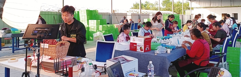 網(wǎng)絡(luò)主播在金臺區(qū)櫻桃分揀打包現(xiàn)場進(jìn)行直播帶貨