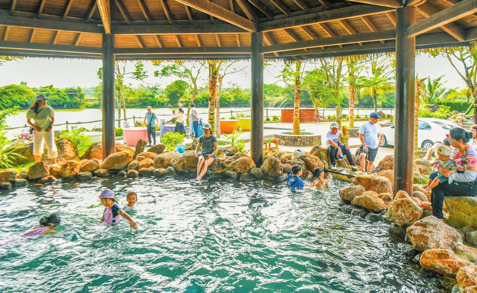 家長帶孩子在龍華區(qū)新坡鎮(zhèn)潭豐洋火山濕地農(nóng)莊泡冷泉 記者 康登淋 攝