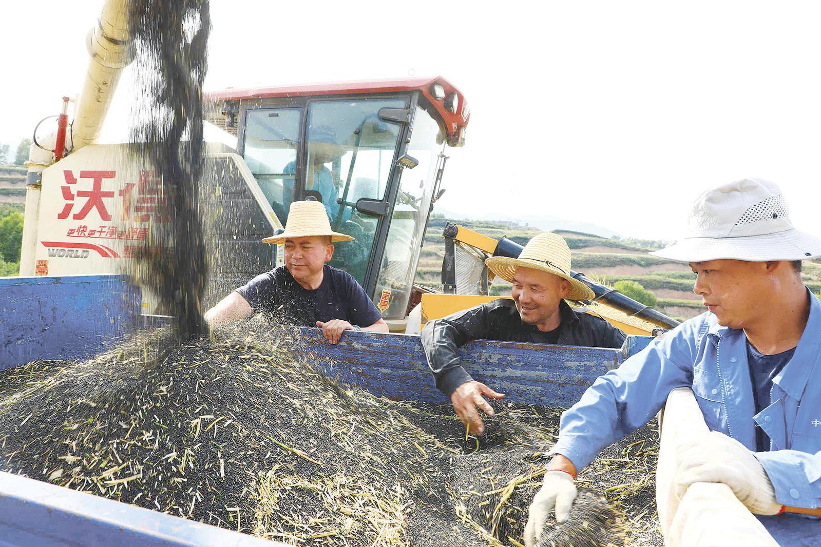 在一處坡洼的田塊里,一臺(tái)聯(lián)合收割機(jī)正在卸糧,收獲的油菜籽從卸糧口傾瀉而下,倒入三輪車斗里。“這塊田以前是撂荒地,我們合作社流轉(zhuǎn)后種植了油菜。今年雨水好,看莊稼長(zhǎng)勢(shì),油菜籽畝均產(chǎn)量至少在150公斤以上。”張家莊村黨支部書記張斌先和村支部委員寧智祥捧起一把黑黝黝的油菜籽,臉上露出收獲的喜悅。