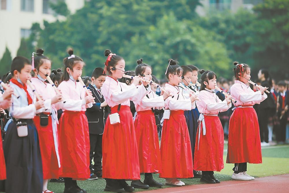 該校在課后延時“七彩”社團活動33個興趣課堂的基礎上,新增了揚琴、莆仙贊句、泥塑、剪紙、太極拳等傳統(tǒng)文化美育課堂,并以社團為單位,組織學生在二十四節(jié)氣來臨前夕抑或每季的節(jié)慶活動上,以美育課堂所學裝扮校園、上臺展演。