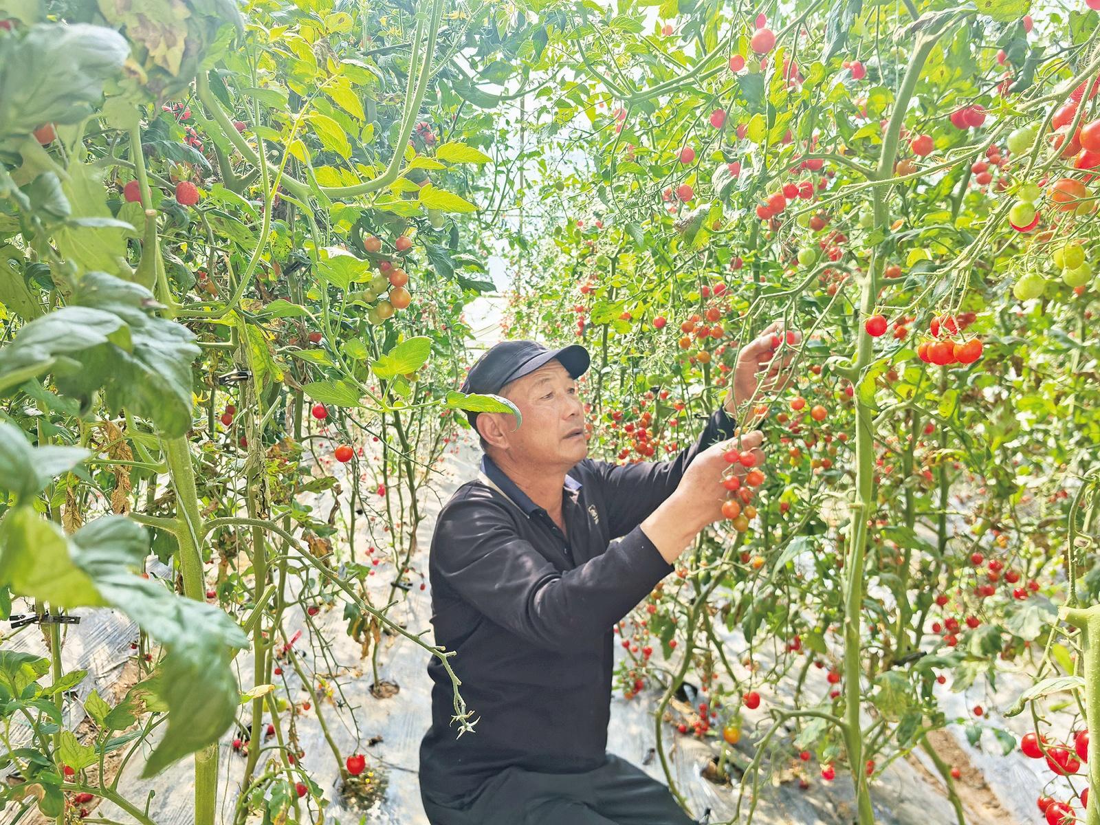 種植戶采摘豐收的櫻桃番茄