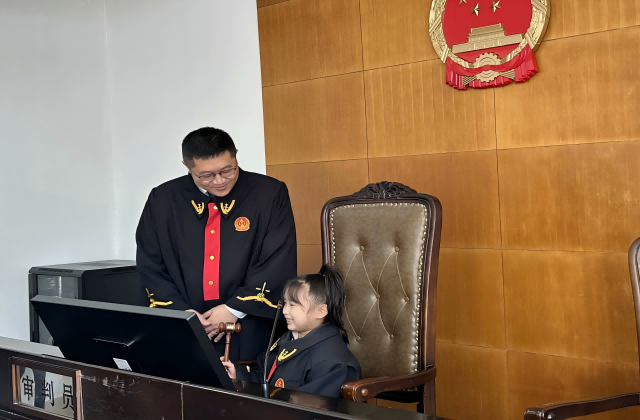 小朋友們在工作人員的帶領(lǐng)下步入審判庭,他們穿上法袍,坐上審判席,敲響法槌,深度體驗(yàn)“小法官”的角色。在工作人員的演示與指導(dǎo)下,孩子們進(jìn)一步知曉了法庭工作人員的職責(zé)。