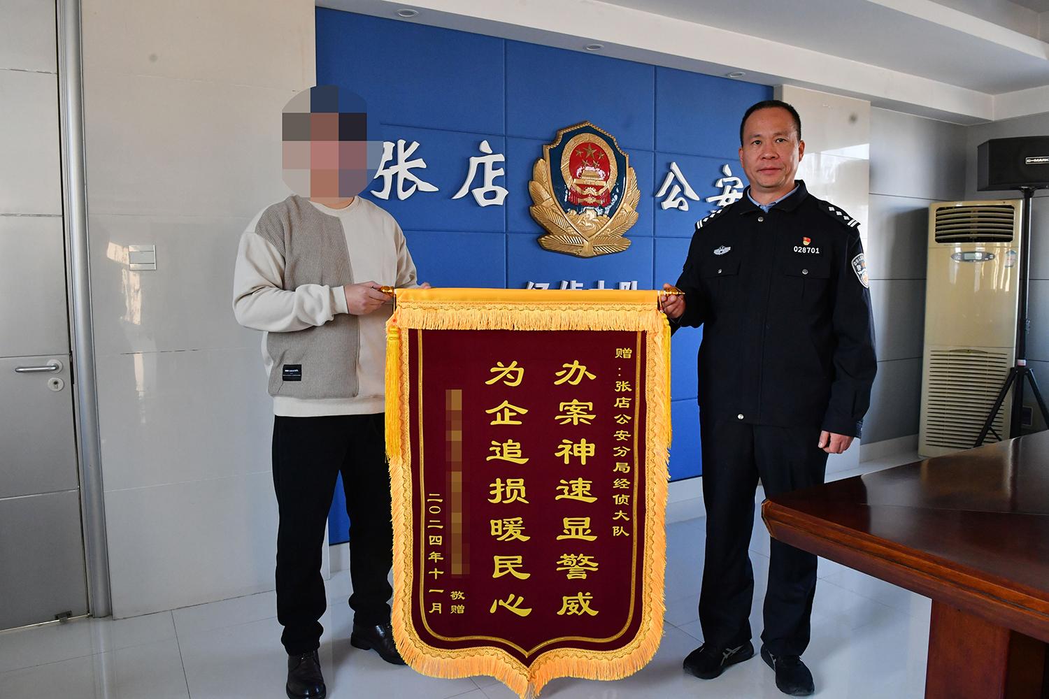 11月7日下午,一場(chǎng)小型退贓儀式在經(jīng)偵大隊(duì)會(huì)議室內(nèi)舉行,民警將12萬(wàn)元現(xiàn)金現(xiàn)場(chǎng)返還給了企業(yè)負(fù)責(zé)人。為表示感謝,企業(yè)負(fù)責(zé)人也將提前制作好的印有“辦案神速顯警威 為企追損暖民心”的錦旗送到了民警手中。